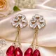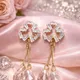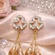 Add timeless elegance to your look with these gold plated crystal drop earrings featuring sparkling baguette stones and blush teardrop pendants. Perfect for weddings, parties, and special occasions.